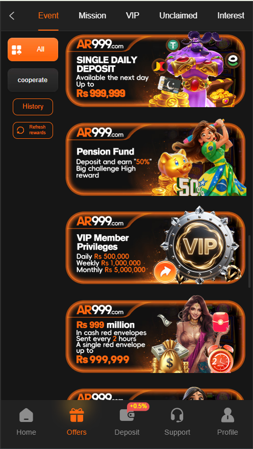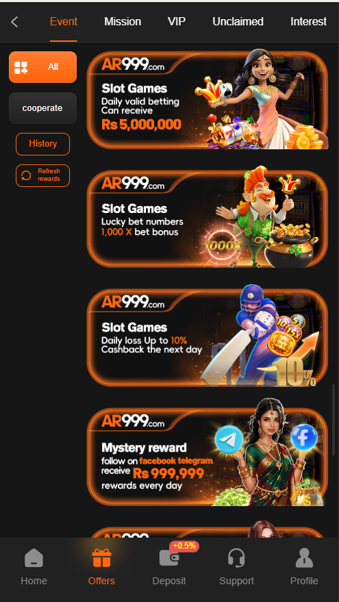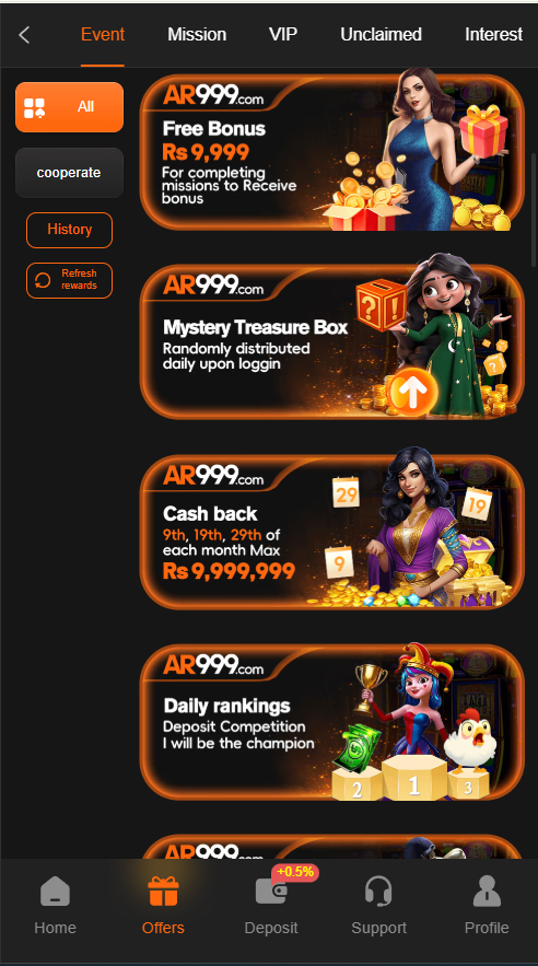 AR999 APK regularly introduces special events and promotional offers. During these events, users can enjoy extra bonuses, cashback, and discounted game entries. These limited-time offers give players more earning opportunities and make the platform more exciting. Event rewards are updated frequently, so users always have something new to benefit from.