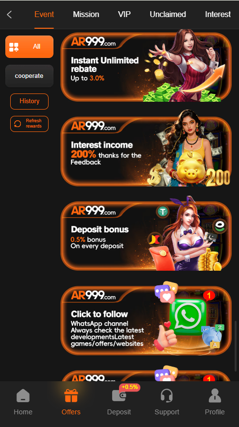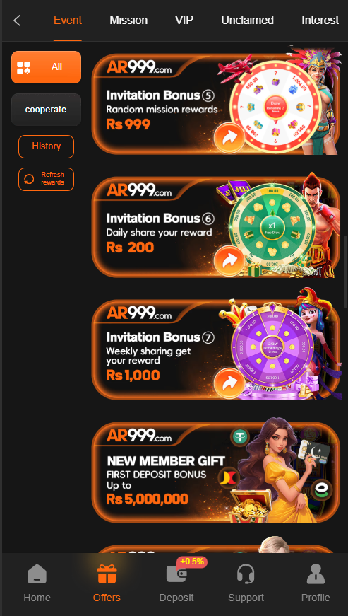 AR999 APK follows a simple rule: bigger deposits receive bigger offers. Users who deposit higher amounts get higher bonus percentages. This increases the total balance and allows longer gameplay. This feature is especially useful for experienced players who want higher earning potential.