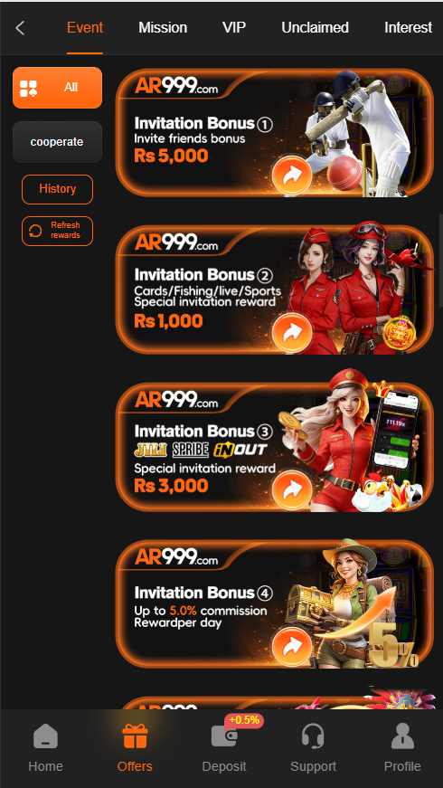 AR 999 game provides a powerful referral system. When you invite one person, you can earn 500 PKR after they join and start playing.